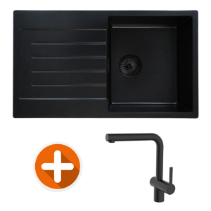 Caressi Quartz Enkele Keukenspoelbak Set 85 x 45 cm Graniet Zwart Met Kraangat Met Zwarte Korfplug Incusief Caressi Keukenkraan Opbouw