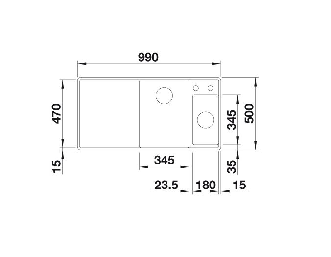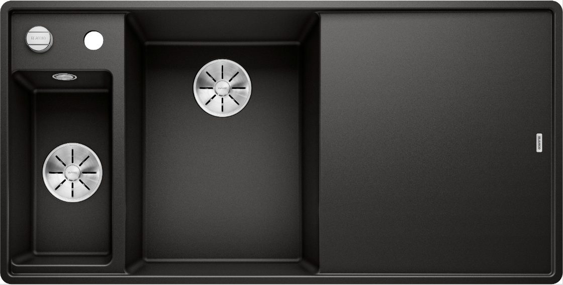 Inclusief snijplank in essenhout-compound, multifunctioneel inzetbakje in rvs, plaatsbesparend afloopgarnituur, InFino korfventielen 3 ½” met draaiknopbediening op de hoofdbak