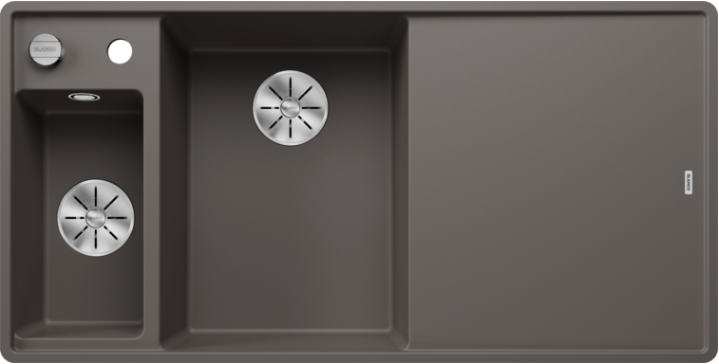 Inclusief snijplank in veiligheidsglas, multifunctioneel inzetbakje in rvs, plaatsbesparend afloopgarnituur, InFino korfventielen 3 ½” met draaiknopbediening op de hoofdbak