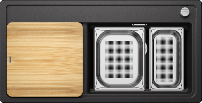 Inclusief snijplank in essenhout-compound, geperforeerde GN 1/3 bak, geperforeerde GN ½ bak, plaatsbesparend afloopgarnituur, InFino korfventiel 3 ½‘‘, met draaiknopbediening