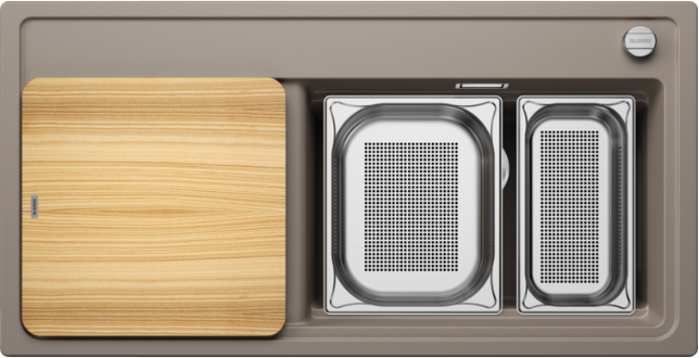 Inclusief snijplank in essenhout-compound, geperforeerde GN 1/3 bak, geperforeerde GN ½ bak, plaatsbesparend afloopgarnituur, InFino korfventiel 3 ½‘‘, met draaiknopbediening