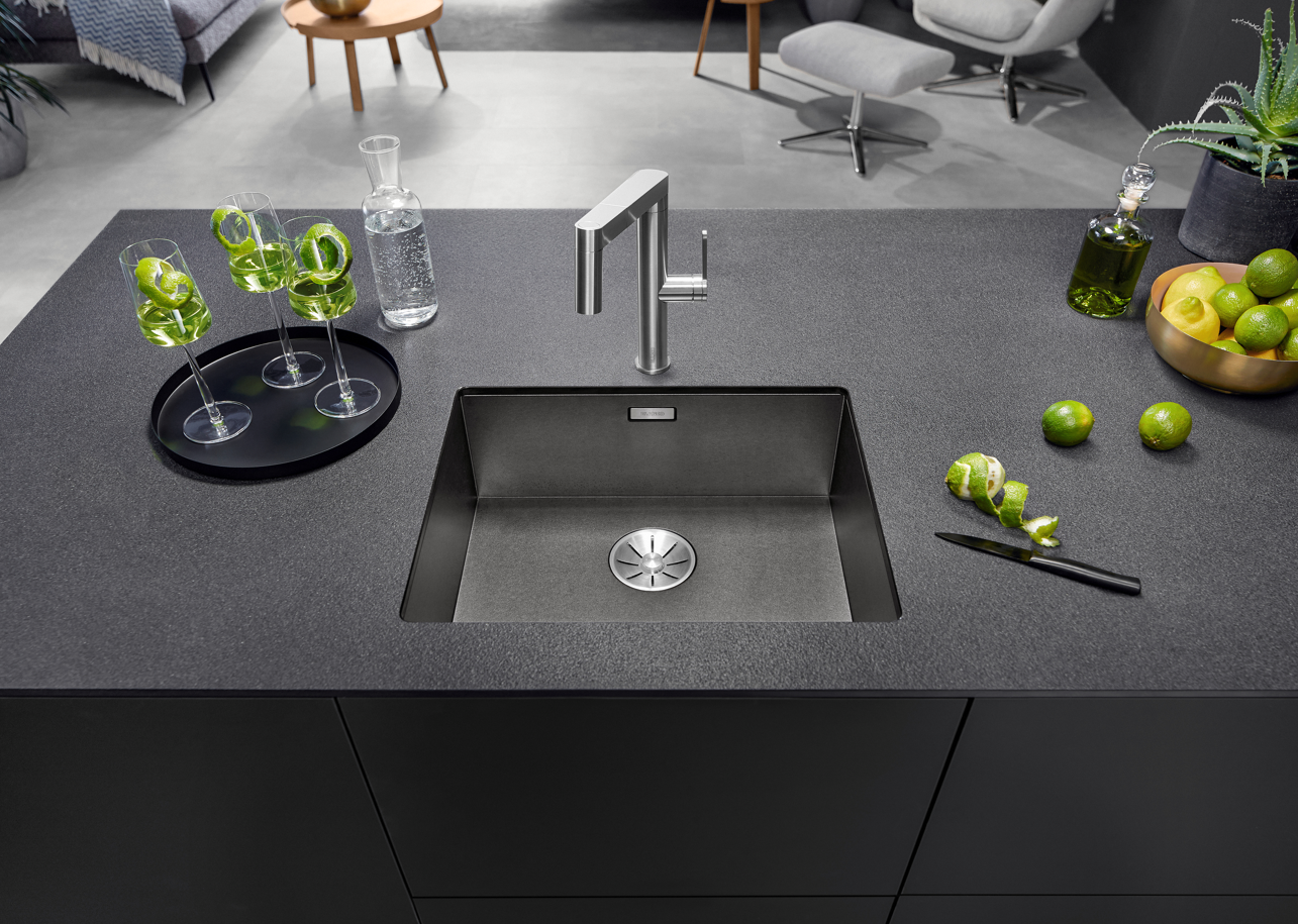 Uitgesproken rechthoekige spoelbak uit roestvrij staal met elegante, donkergrijze oppervlakken