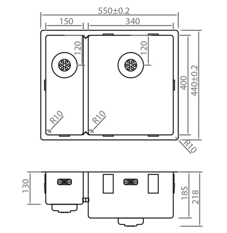 Deze spoelbak past perfect in een kast van minimaal 600 mm breed en biedt met zijn royale afmetingen (550 x 440 mm) voldoende ruimte voor dagelijks gebruik. De R10-hoekradius zorgt niet alleen voor een modern uiterlijk, maar maakt het schoonmaken van de spoelbak ook eenvoudiger. Het ontwerp omvat een handige overloop en een bijgeleverd korfplugset, zodat zowel functionaliteit als comfort gegarandeerd zijn.