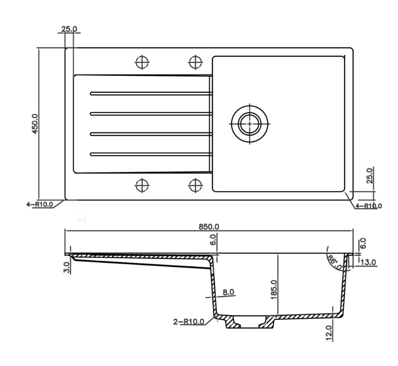 Black Line Quartz Composiet, diepte 185mm, inclusief korfplugset met design overloop en klemmen. Inclusief meegeleverde keukenkraan CABL003CHU Chroom. De bak altijd als mal gebruiken voor de uitsparing in het blad. Afmetingen (BxD): inwendig: 390 x 400mm, uitwendig: 850 x 450mm.