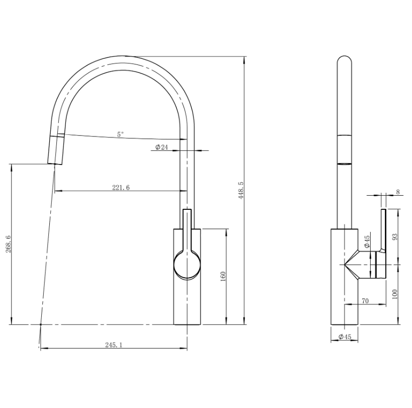 – Uitloophoogte van 448,5 mm en diepte van 221,6 mm voor optimaal gebruiksgemak