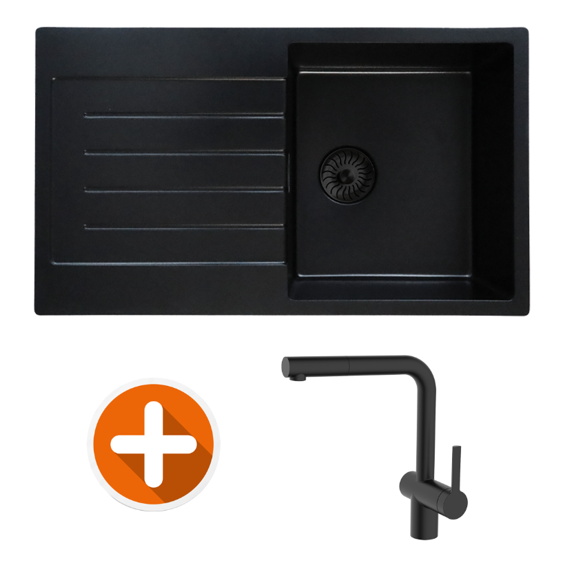 Caressi Quartz Enkele Keukenspoelbak Set 85 x 45 cm Graniet Zwart Met Kraangat Met Zwarte Korfplug Incusief Caressi Keukenkraan Opbouw €635.00 Oorspronkelijke prijs was: €635.00.€325.00Huidige prijs is: €325.00.