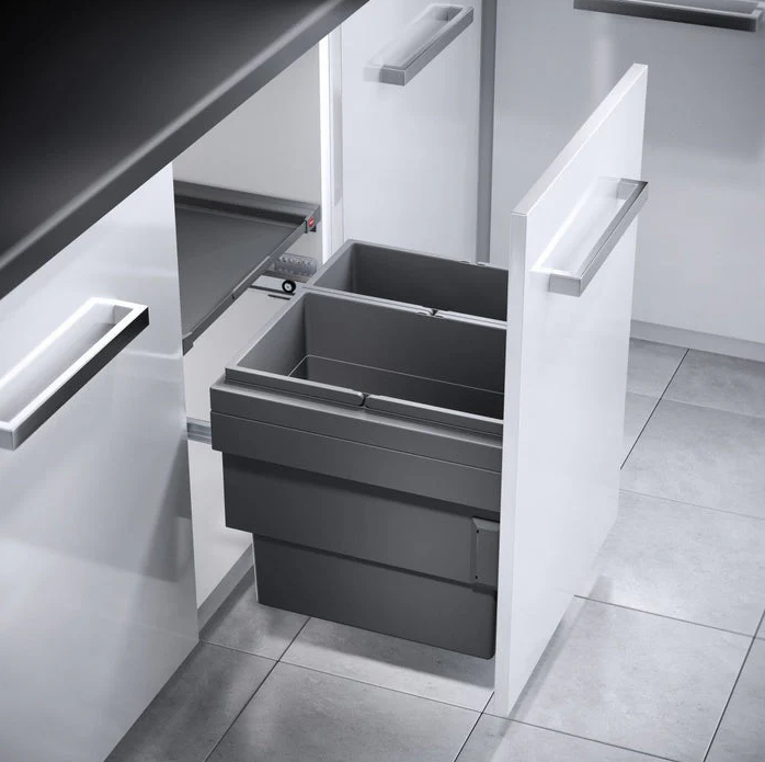 Dankzij de dempende softclose-functie en overtravel-technologie opent en sluit het systeem stil en soepel. De twee compartimenten maken afvalscheiding eenvoudig en efficiënt – ideaal voor milieubewuste huishoudens die geen concessies willen doen aan comfort of uitstraling.