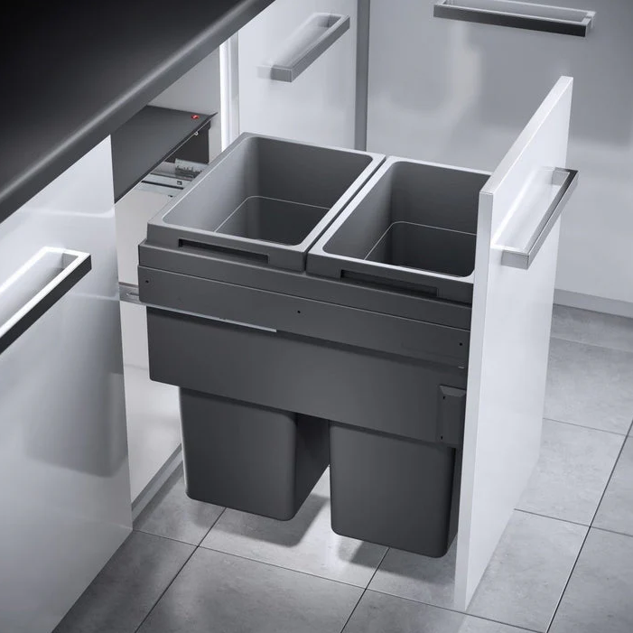 Dankzij de hoogwaardige synchronisatiegeleiders opent het systeem soepel en volledig, waardoor je eenvoudig toegang hebt tot beide afvalbakken. Het stevige metalen deksel zorgt voor een hygiënische afsluiting en voorkomt nare geurtjes in je keukenkast.
