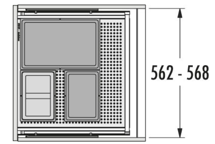 Inbouwmaten (bxdxh): 562-568 x 400 x 345 mm. Inhoud: 34 liter, emmers: 1 x 18 liter en 2 x 8 liter (waarvaan 1 met deksel) . Met uitschuifbaar multi-functie kunststof deksel.