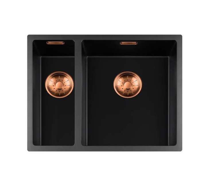 Zwarte quartz spoelbak met ronde korfplug.
