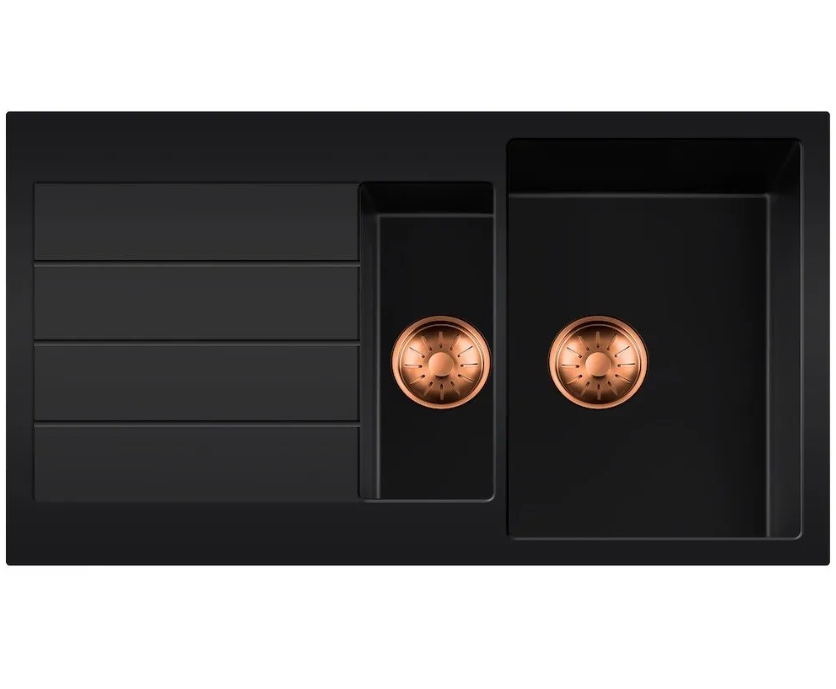 Zwarte quartz spoelbak met afdruipgedeelte en ronde korfplug.