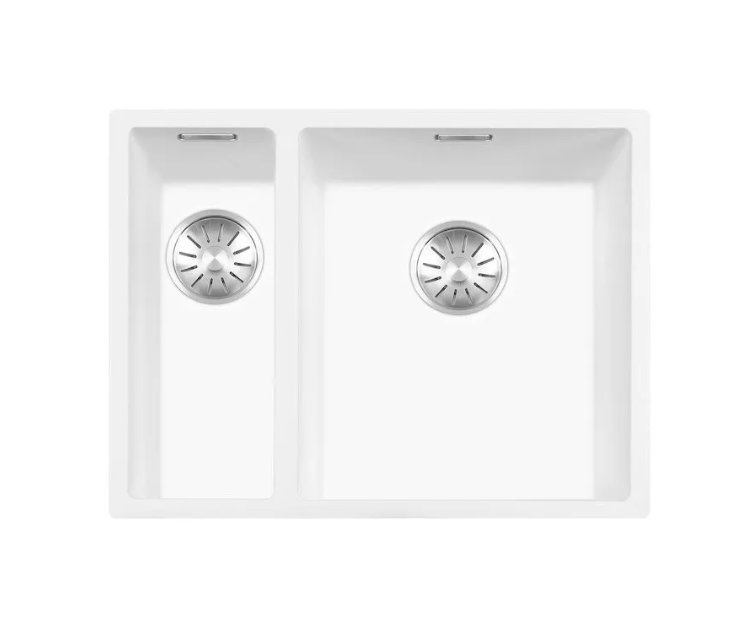 Witte quartz spoelbak met ronde korfplug.