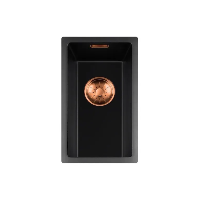 Zwarte quartz spoelbak met ronde korfplug.
