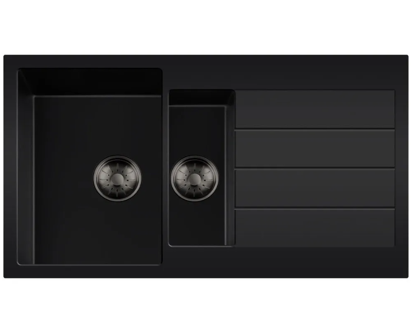 Zwarte quartz spoelbak met afdruipgedeelte en ronde korfplug.