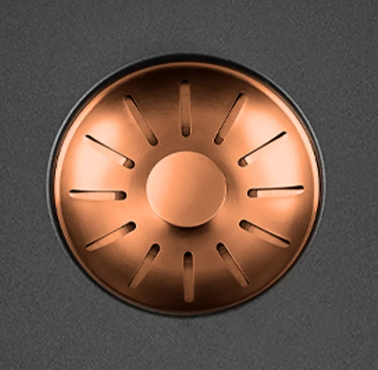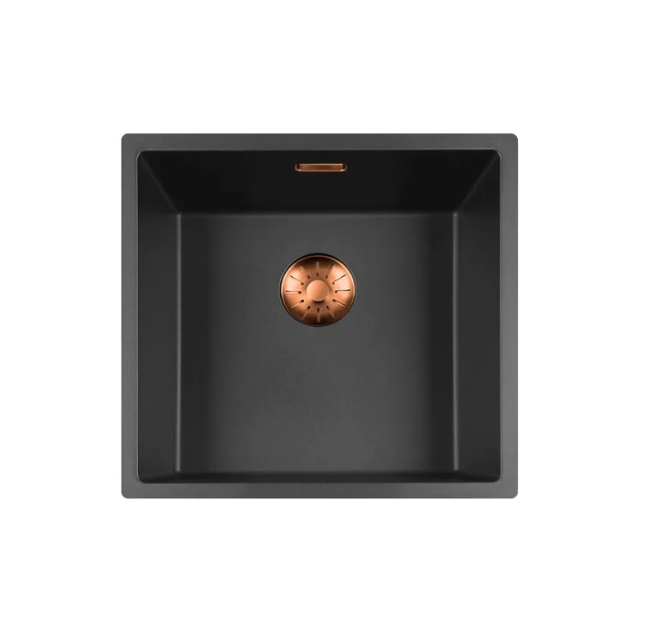 Zwarte quartz spoelbak met ronde korfplug.