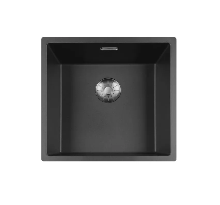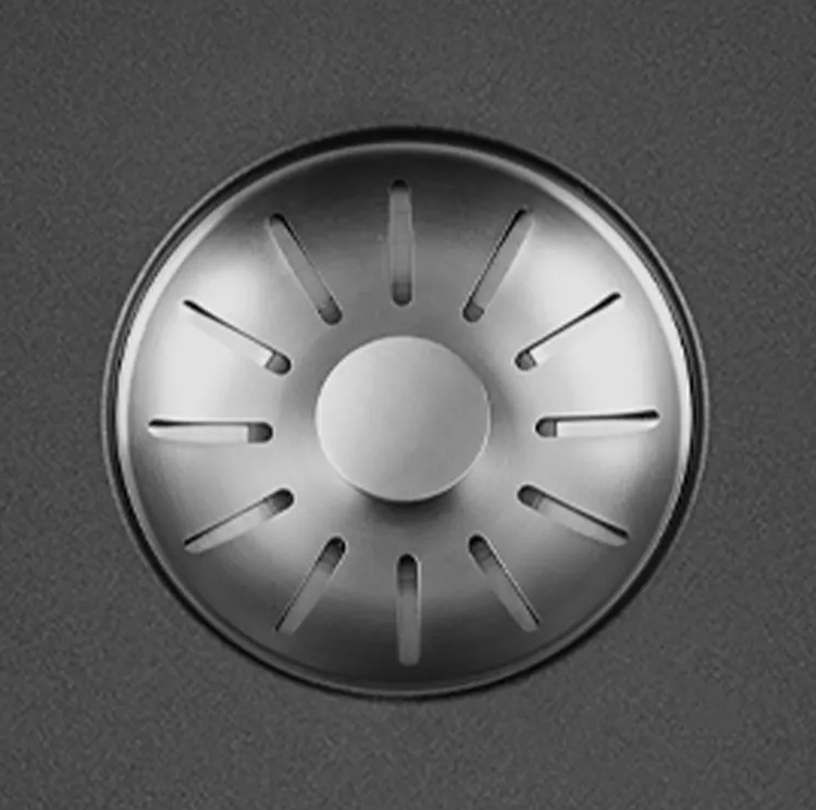 Zwarte quartz spoelbak met ronde korfplug.