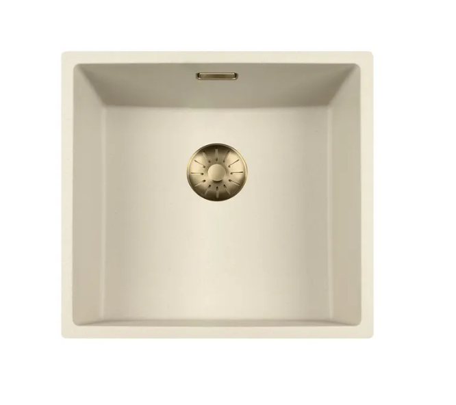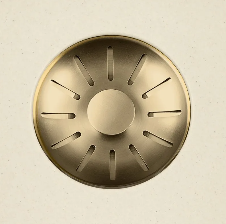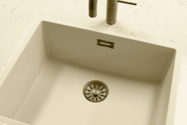 Coffee cream quartz spoelbak met ronde korfplug.