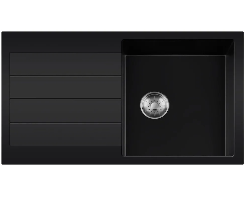 Zwarte quartz spoelbak met afdruipgedeelte en ronde korfplug.