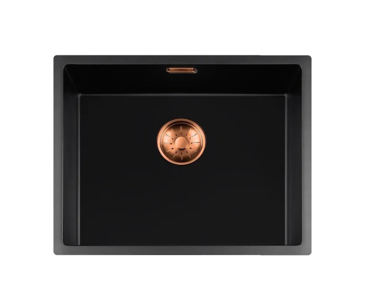 Zwarte quartz spoelbak met ronde korfplug.