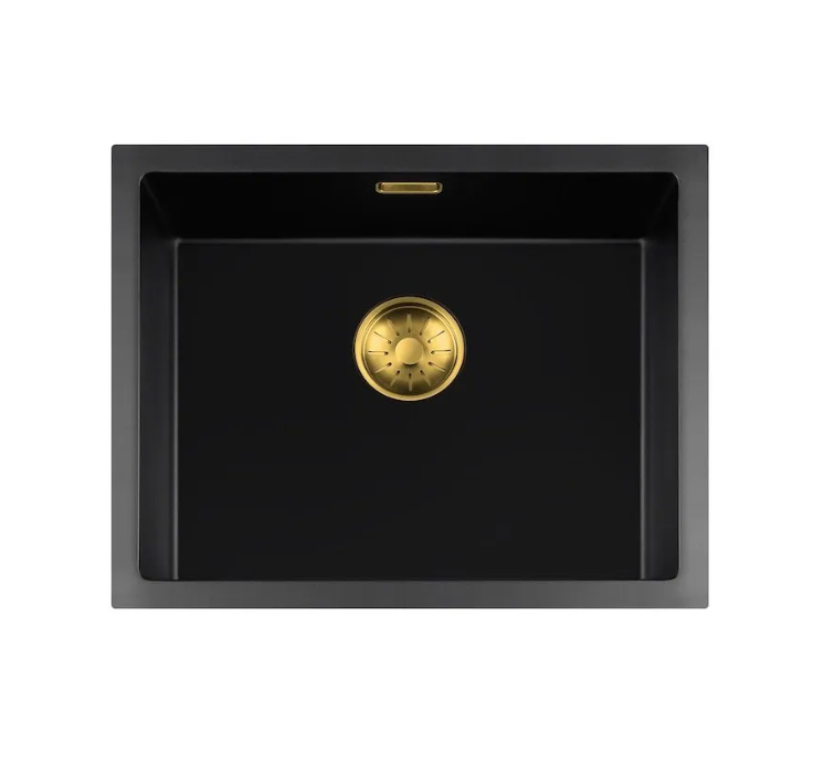 Zwarte quartz spoelbak met ronde korfplug.