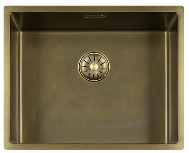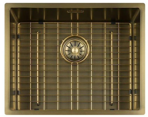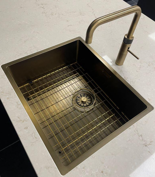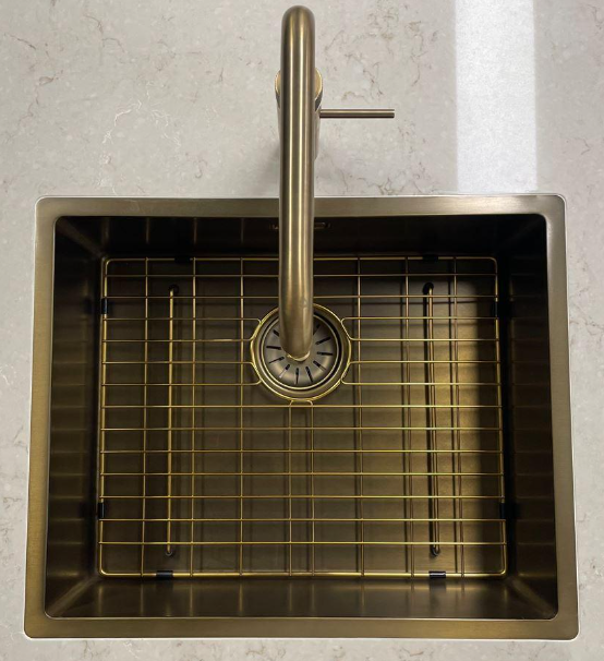 De spoelbak verkleurd niet en behoud de dubbele PVD Patina afwerking wordt geleverd inclusief bodem rooster