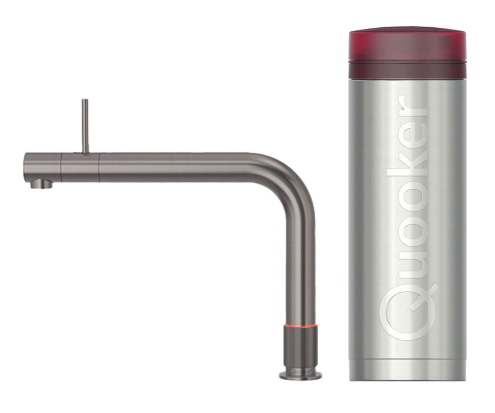 De PRO3 Front in Gunmetal is het allernieuwste model van Quooker. De kraan heeft een compleet nieuw design en is tegelijkertijd van alle gemakken voorzien die u van Quooker mag verwachten. De bediening voor koud en warm water bevindt zich aan de voorkant van de uitloop, zodat het tappen extra gemakkelijk is. Dit maakt de kraan zowel ergonomisch verantwoord als uitgesproken in design. De bediening voor kokend water bevindt zich in de kartelknop om de uitloop heen. Tevens is de kraan verkrijgbaar in de kleur zwart.