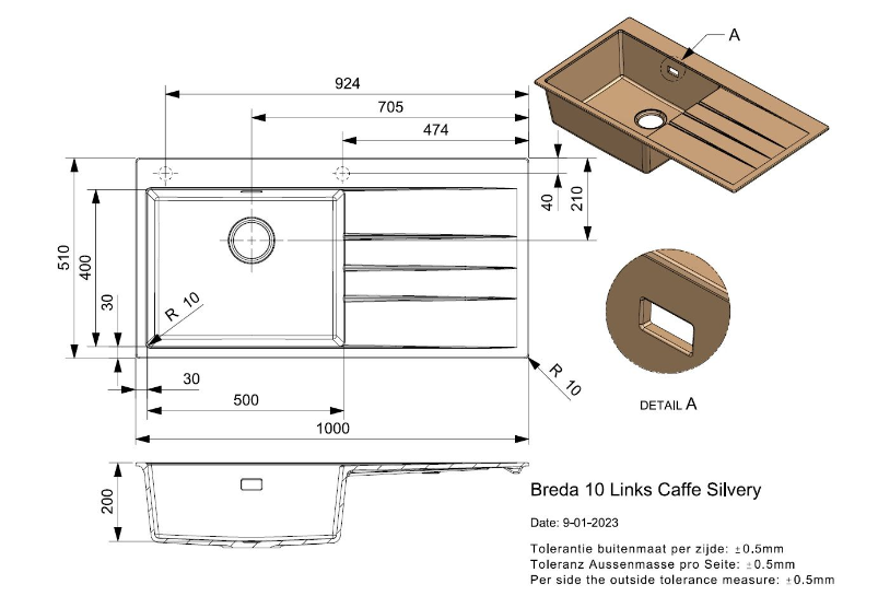 Reginox Breda 10 Caffe Silvery R33593 Enkele Keukenspoelbak Links Graniet Opbouw