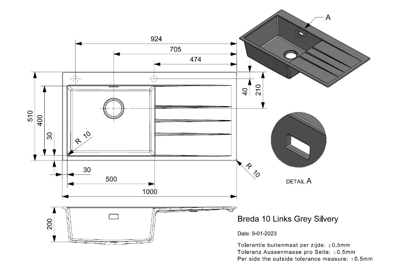 Reginox Breda 10 Grey Silvery R33616 Enkele Keukenspoelbak Links Graniet Opbouw