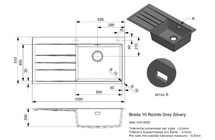 Totale afmeting: 1000 x 510 x 200 mm