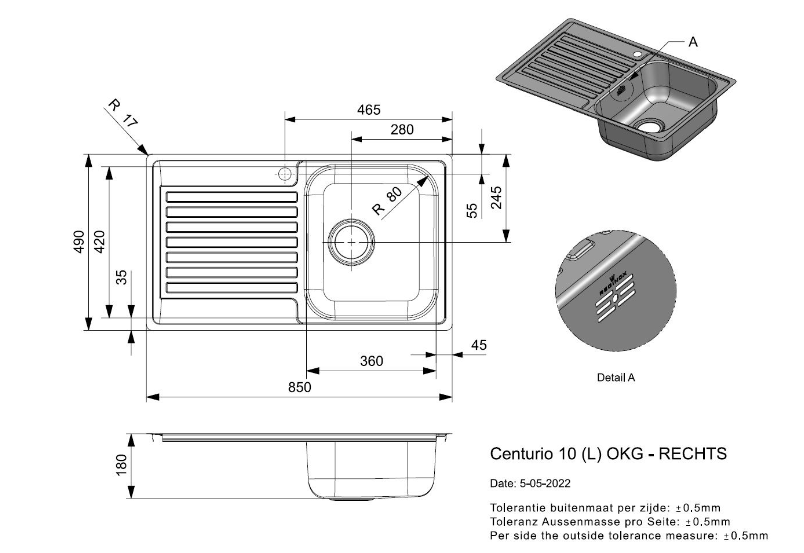 Totale afmeting: 850 x 490 x 180 mm
