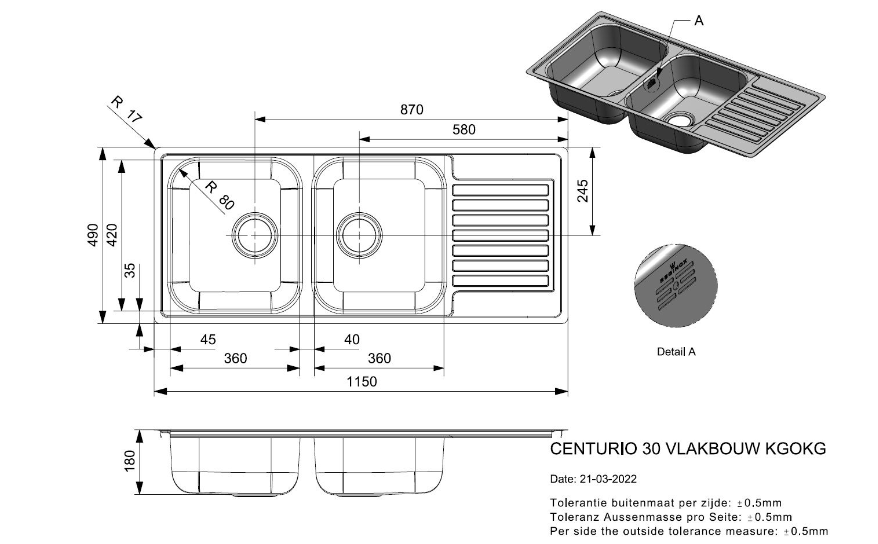 Totale afmeting: 1150 x 490 x 180 mm