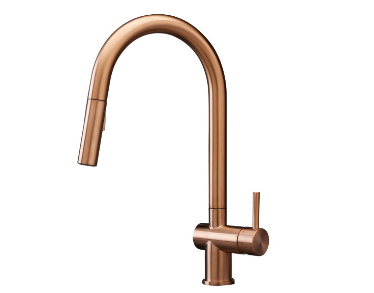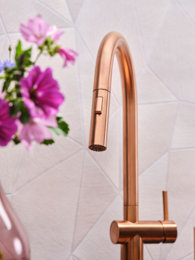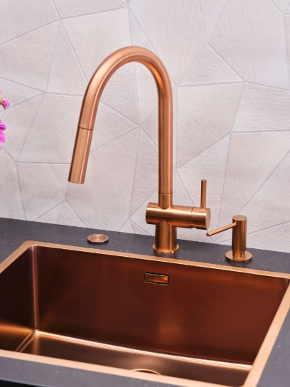 • Een eenhendel keukenkraan van PVD copper
