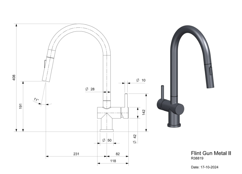 Reginox Flint Gun Metal II R38819 Eenhendel Keukenmengkraan Gunmetal Met Uittrekbare Handdouche