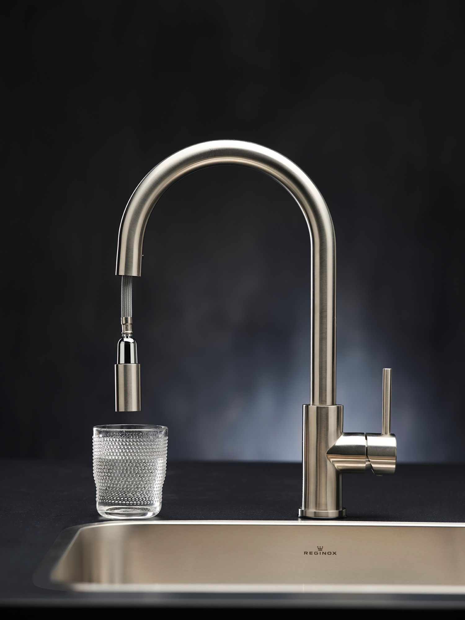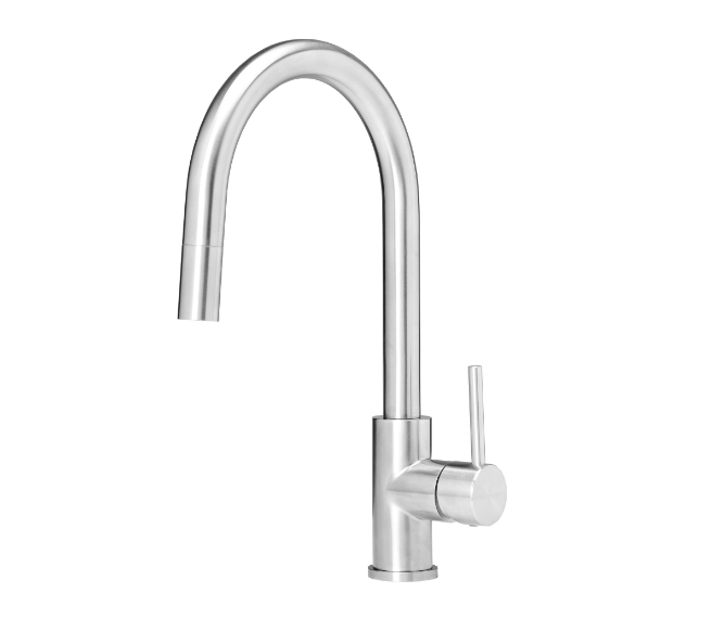 • Een eenhendelkraan van geborsteld rvs, voorzien van een pull-out mogelijkheid