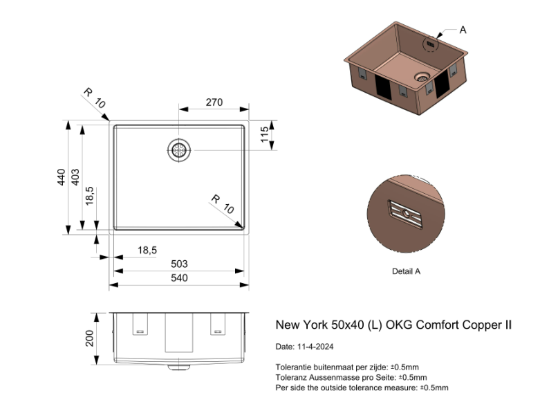 Reginox New York R38758 (L) OKG Comfort Copper II Luxe Enkele Keukenspoelbak Copper 50 x 40 Onderbouw – Vlakbouw – Opbouw
