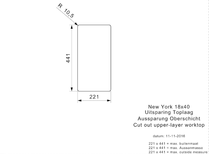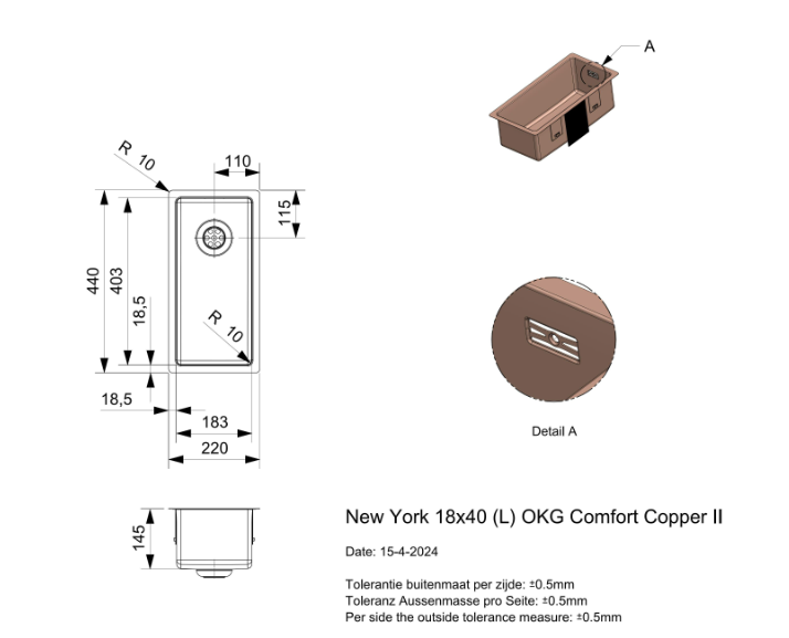Reginox New York R39373 (L) OKG Comfort Copper II Luxe Enkele Keukenspoelbak Copper 18 x 40 Onderbouw – Vlakbouw – Opbouw