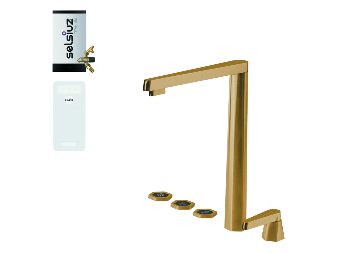 Selsiuz By Osiris Design Hexagon Gold 350699 Met Single Boiler Van Titanium 5 in 1 Cool En Kokend Water Keukenkraan Goud