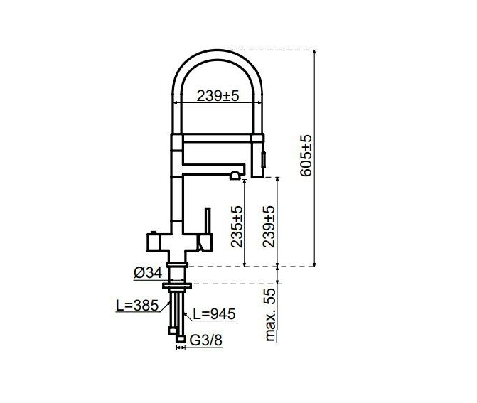 De drukknop op het keukenblad is stijlvol en functioneel. voor kokend water drukt u twee keer op de knop. Door dit Click Click Go systeem is deze alles in een kraan veilig voor kinderen. De rechter hendel geeft koud en warm water.