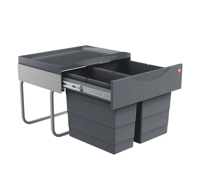 De Hailo Tandem-S Voluittrek – 30 liter is dé ruimtebesparende oplossing voor draaideurkasten vanaf 500 mm breed. Dit ingenieuze afvalsysteem beschikt over twee binnenemmers (18L + 12L) én een slimme opbergruimte in het deksel – ideaal voor vuilniszakken of schoonmaakaccessoires. Dankzij de volledig uittrekbare geleiders heb je altijd snel en eenvoudig toegang tot beide bakken.