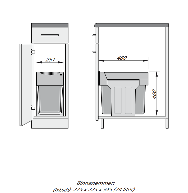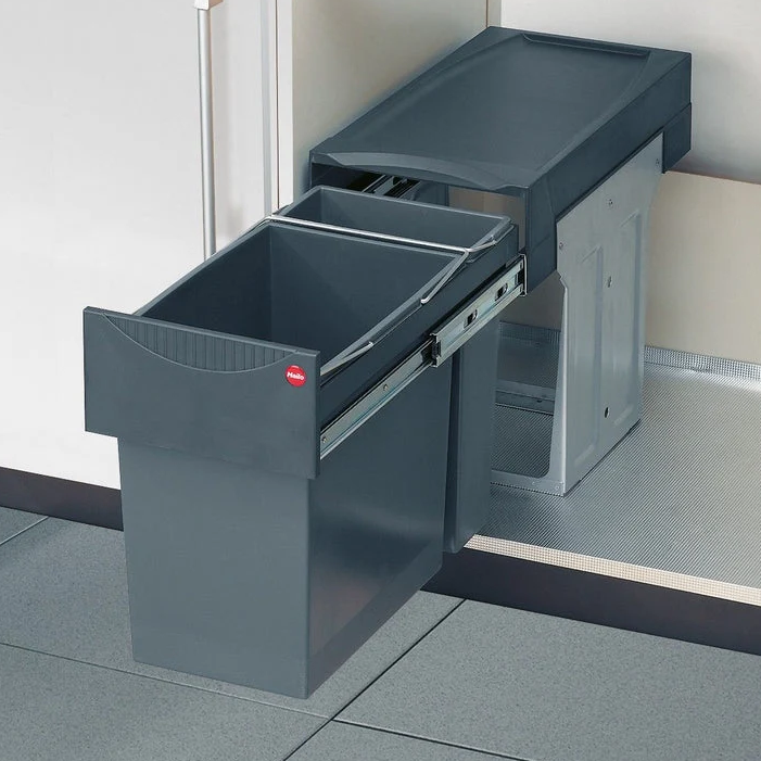 Dankzij het praktische zwenkmechanisme en de volledig uittrekbare geleiders heb je altijd optimale toegang tot beide bakken. De combinatie van verschillende volumes maakt het eenvoudig om afvalstromen gescheiden te houden – bijvoorbeeld restafval en GFT – terwijl het systeem netjes verborgen blijft achter de kastdeur.